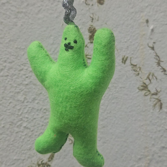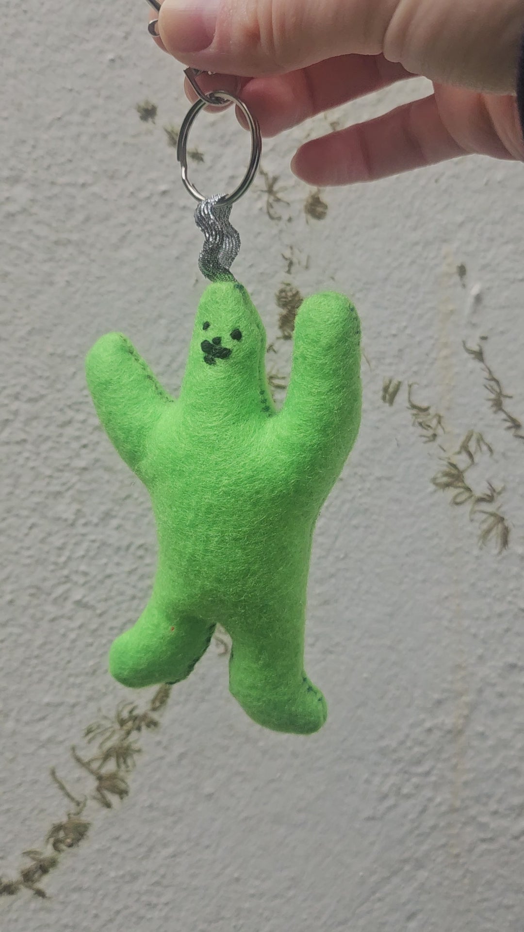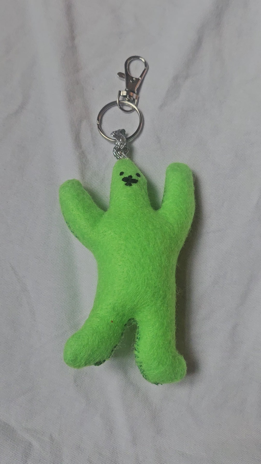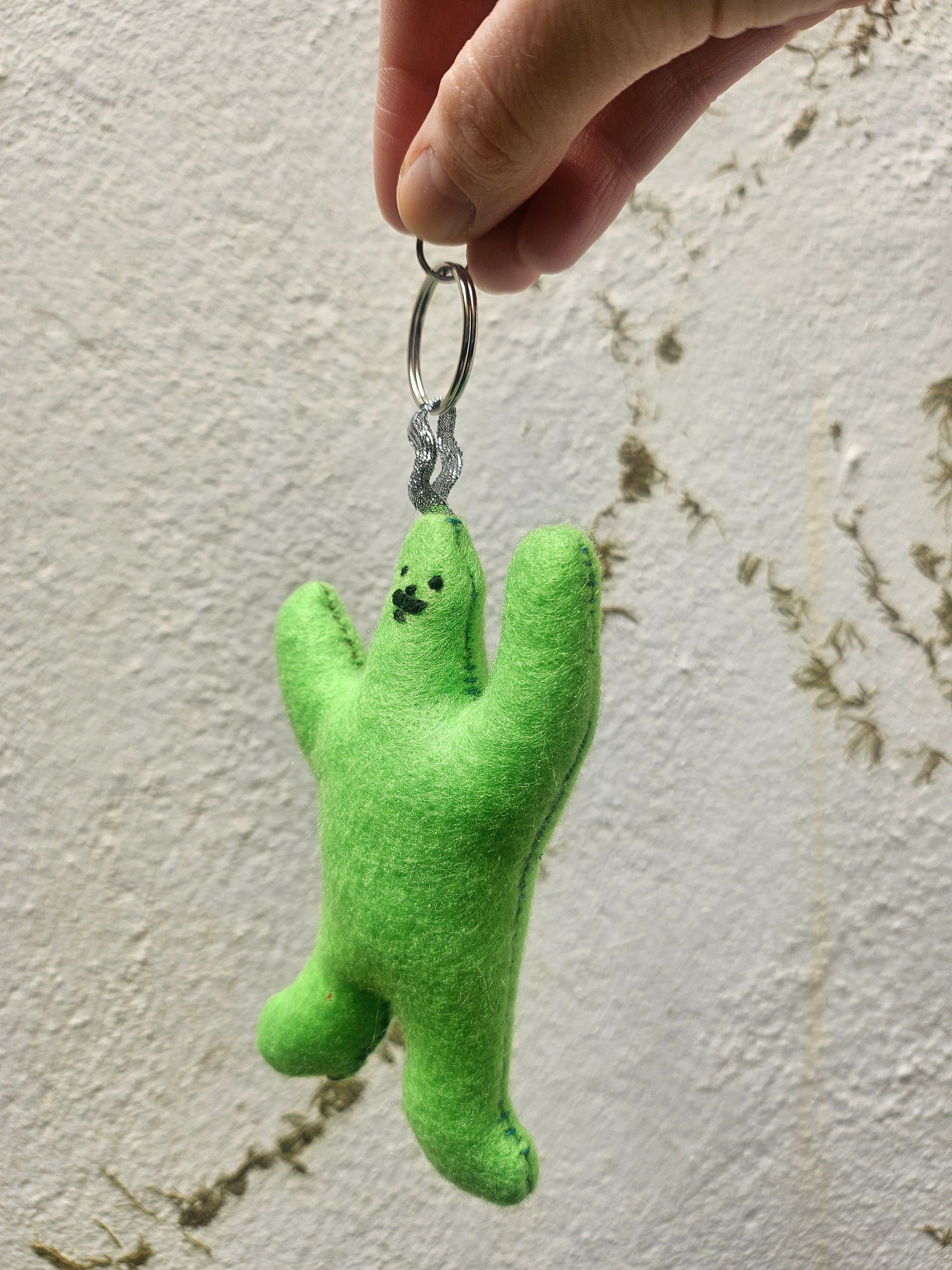 Green felt plushie with detachable keyring. Hand cut and sewn by me! Stuffed with 100% Hi-loft Polyester soft toy filling. Little embroidered moustache.