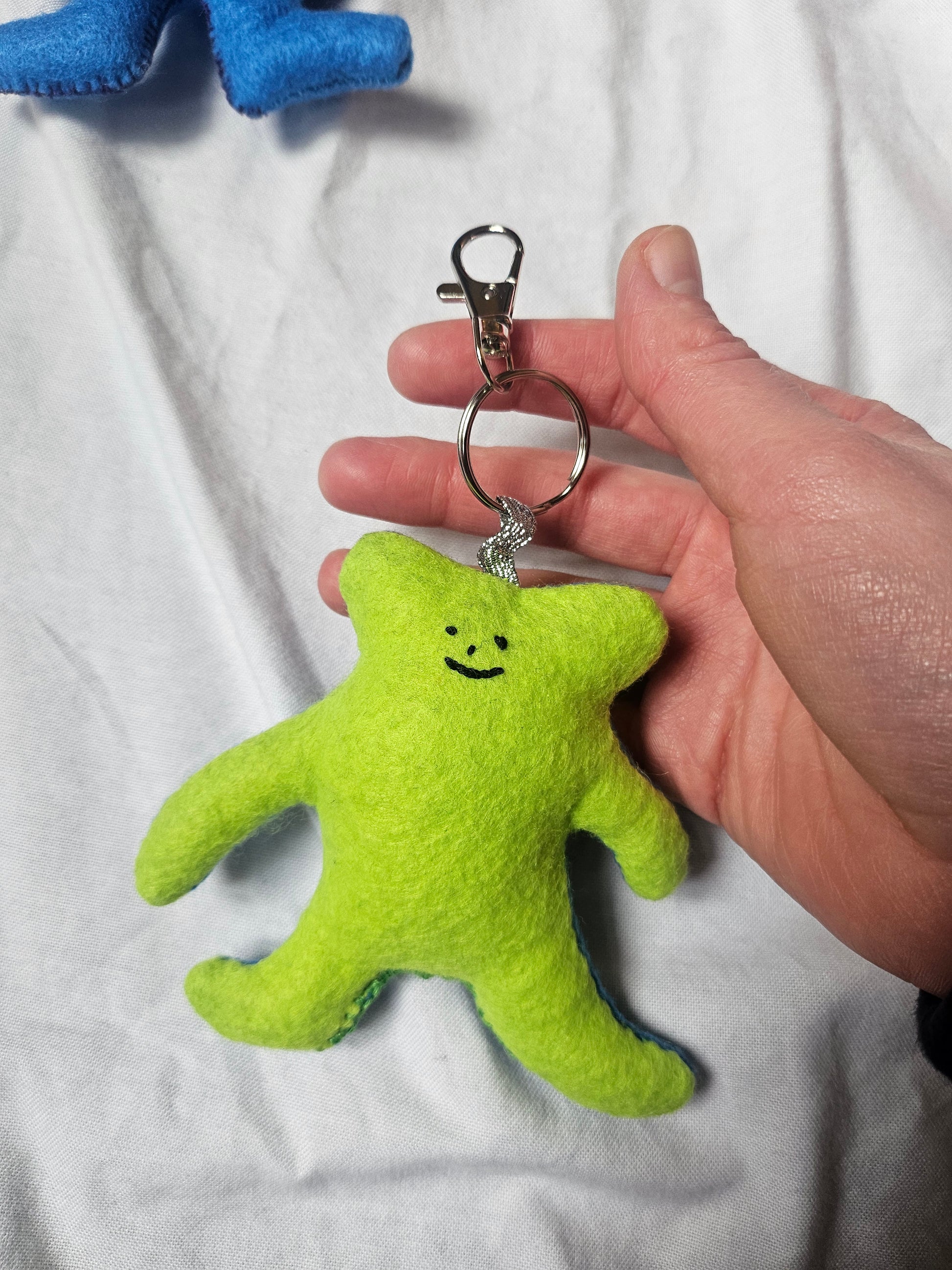 Green and blue goblin felt plushie with detachable keyring. Hand cut and sewn by me! Stuffed with 100% Hi-loft Polyester soft toy filling.